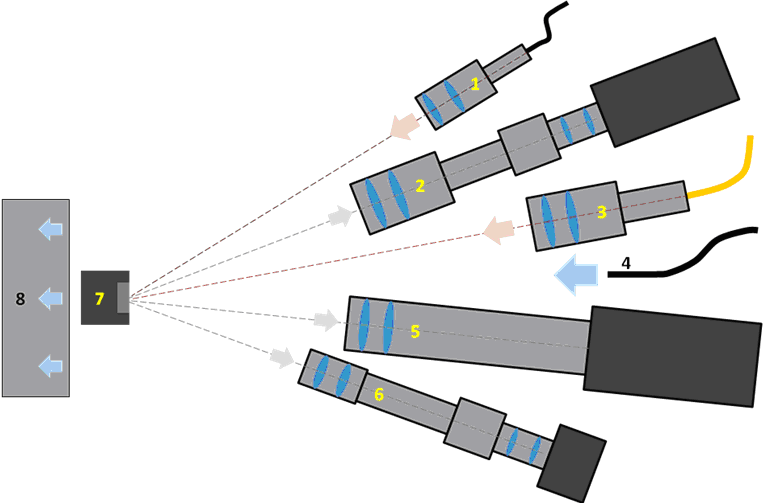 4 – трубка подачи воздуха, 5 – высокоскоростная видеокамера, 6 – пирометр ближнего ИК диапазона, 7 – держатель образца, 8 – вытяжка.