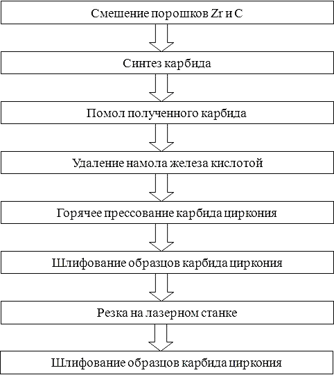 Порошок карбида спекался в таблетки высокой плотности на установке горячего прессования при температуре 2123 К и давлении порядка 60 МПА. Полученная таблетка подвергалась лазерно-эрозионной обработке для получения трех образцов с одинаковыми свойствами (состав, плотность). Характеристики полученных образцов определялись различными методами анализа: методами динамической вспышки и восстановительного плавления, рентгенофазовым анализом.