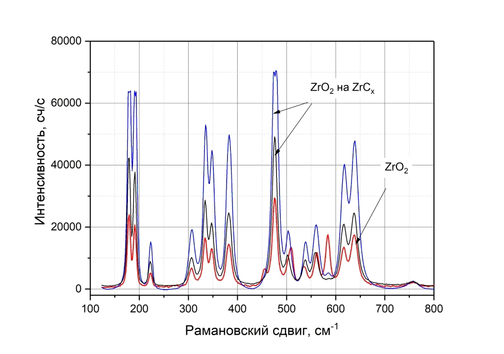 После нагрева поверхности образцов в окислительной среде выполнялся анализ изменений в структуре и составе приповерхностного слоя. Поверхность оксидной пленки была изучена методами электронной микроскопии (Рисунок 2), рентгенофазового анализа и с помощью рамановского рассеяния (Рисунок 3). Показано, что фаза, образованная в результате лазерного воздействия, является моноклинной двуокисью диоксида циркония