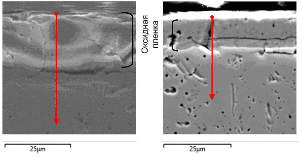 Рисунок 2. Поперечный срез образца ZrC0.90 – после нагрева со скоростью 8000 К/с (a) и 3000 К/с (b) в окислительной среде.